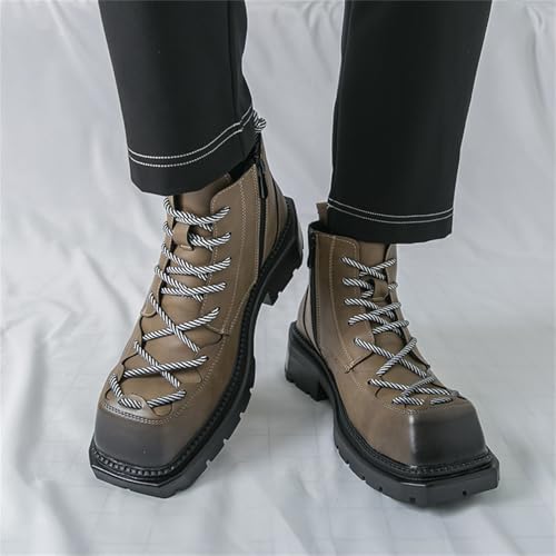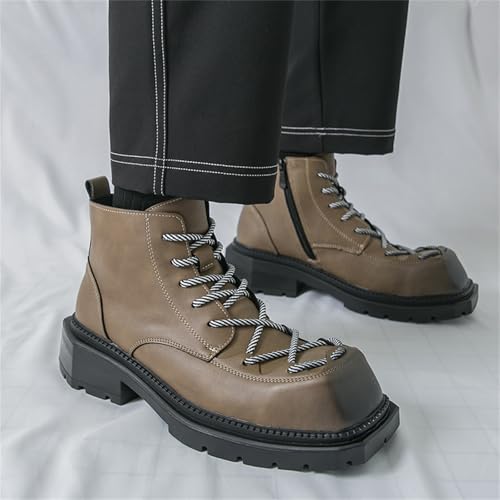 Mens Leather Lace-Up Chunky Platform Heels Chukka Ankle Boots Casual Non-Slip Square Toe Dress Combat Boot for Walking Formal Business
