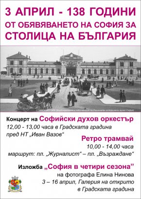 Днес се навършват 138 години от обявяването на София за столица на България. На 3 април (22 март по стар стил) през 1879 г. Учредителното събрание в старопрестолния Велико Търново избира за столица на Княжество България град София. Предложението е на известния историк, учен и държавник проф. Марин Дринов. По данни от 1878 г., София има 11 694 жители, 2 училища, 7 църкви, 10 хана, 120 дюкяна, 62 механи, 19 фурни и 3 306 къщи, а общата й площ е 2,84 кв. км.
