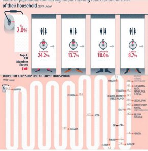 13,7 процента от българите нямат тоалетна в жилището си и се налага да ползват външна, показват актуални данни на Евростат. По този показател в Европа обаче не сме първи - преди нас са румънците, където почти всеки четвърти (24,2%) не разполага с едно от удобствата на 21 век. Висок е процентът и в Литва и Латвия - съответно 10% и 8,7%. Според данните на европейската статистика в Швеция, Швейцария, Исландия и Норвегия броят на външните тоалетни е нулев и всички имат вътрешна. Проучването е по повод Световния ден на тоалетната 19 ноември.