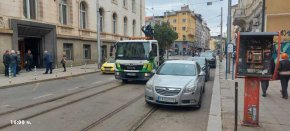 След публикацията ни от вчера за новообразуваните „паркинги” в забранени зони, ЦГМ проведе акция и към 12.30 часа прочисти насрещното платно на ул.Алабин, върху чиито релси бяха гарирали нагли шофьори – последният вдигнат е върху „паяка”, който се включва в движението на фотото. Минути по-късно първият нов от наглите спря безплатно на забраненото място. ВИЖ СНИМКИ ТУК!