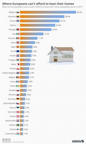 България е начело на класацията по енергийна бедност в ЕС. На база 2017 г., а оттогава и парното, и токът у нас са с нови ставки и сме по-зле. Към 2017 г. 36,5% от населението у нас или над 2,2 млн. души не могат да си позволят отопление. При комшиите ни от Румъния, с които винаги се сравняваме, този процент е над 3 пъти по-нисък – 11,3%, а зъзнеха при 14 градуса вкъщи при соца. Близо до нас, но с над 10% по-нисък процент са Гърция и Кипър, но това са много по-топли държави. В Чехия, която пък е в дъното на тази негативна класация, едва 3,1% от хората не могат да си платят парното и топлата вода, като бившата соцстрана отстъпва само на най-богатите в ЕС – Скандинавия и Люксембург, където процентът е 2.