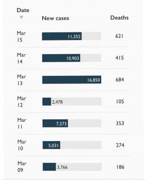 След пика на 13 март, световната статистика показва спад на броя на заразени от коронавирус. Към 14 часа в понеделник активните са 85 617 в целия свят с над 7-милиардно население. Напълно оздравелите са 77 257 като след Китай, където вече почти всички се оправиха, вече и Иран отива към половината първоначално засегнати и свали нивото на смъртност от 15% в началото на истерията до малко над 2%, колкото е в момента в Испания – страната с най-добра здравна система в Европа, и във Франция. В Германия смъртността е 0,3%, под 1% е и в Корея. Сред шампионите с 0 смъртни случая е Виетнам. България е на 55-о място по брой заразени и на предпоследно по смъртни случаи. Интересно е, че от 150 държави със заразени в 98 няма нито 1 смърт С корона, а само в 42. От тези 98 страни само със заразени, в 25 страни има само по 1 единствен случай на заразен изобщо. Само в Италия положението е наистина тежко и по брой заразени, и по брой смъртни случаи. Премиерът Конте смята, че пикът наближава, но не е достигнат. Специалистите очакват това да стане тази седмица, след което, както стана в Китай, да има рязък СПАД.