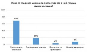 Оказва се, че по-голямата част от запитаните възприемат мнението, че протестите са спонтанни – 69% споделят това становище. Като платени ги определят 19%, а като криминални - 4 на сто от анкетираните. Останалите не могат да преценят.