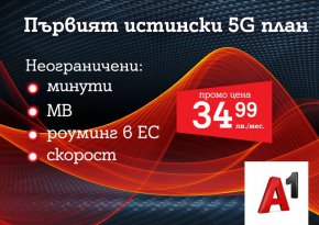 Седмица след като А1 спечели търга, организиран от Комисията за регулиране на съобщенията за разпределение на радиочестотния спектър 3,6GHz, телекомът вече предлага първия 5G тарифен план в страната. Достъпът до 5G ще бъде част в най-новия мобилен план А1 Unlimited. Той беше представен по-рано този месец и включва безкрайни минути, неограничени мегабайти без лимит на максималната скорост и неограничени SMS и MMS – в България и в роуминг в ЕС. От днес A1 Unlimited вече предлага и безкрайни мегабайти на максимална скорост и в 5G мрежа в страната и ЕС.