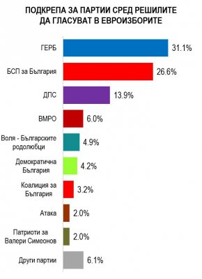 Възвръщане на електоралната преднина на ГЕРБ при намаляване на относителната тежест на БСП, отчитат от „Алфа Рисърч“. Управляващите се ползват с подкрепата на 31.1% от решилите да гласуват срещу 26.6% за БСП. ДПС очаквано мобилизира привържениците си в последните дни преди вота и завършва кампанията като трета политическа сила с подкрепата на 13.9% от решилите да гласуват. ВМРО запазва позициите си отпреди месец и с 6.0% от твърдо решилите заема четвъртата позиция. Сериозната конкуренция в тази ниша идва не толкова от НФСБ и „Атака“ (и двете партии приключват кампанията с изравнени позиции от по 2.0%), а от „Воля“ - 4.9%. Сред колебаещите се до последно са и десните избиратели, които са основна електорална база на „Демократична България“. В края на кампанията обединението между ДСБ, „Да, България" и „Зелено движение" получава 4.2% подкрепа сред решилите да гласуват. Така, наред с ВМРО и „Воля“, „Демократична България“ запазва шансове за мандат в Европейския парламент, ако успее да мотивира своите избиратели да отидат до урните.