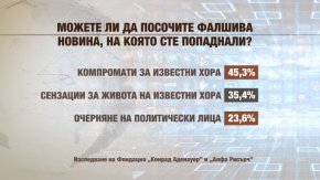 Това е голям процент и затова попитахме какво хората в България разбират под фалшива новина, обясни Боряна Димитрова от „Алфа рисърч”. Близо 45% отговарят, че това са компромати срещу известни хора, а 35%, че става въпрос за сензации за известни хора.