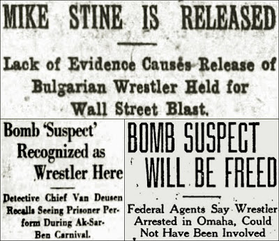 Годината е 1920-а. Датата е 16-и септември. Часът е 12:01. Мястото е улица Уол Стрийт в Манхатън. На пръв поглед това e един напълно нормален четвъртък и тогава изведнъж файтон, спрян пред банка „Джей Пи Морган“, се взривява. Вследствие на взрива загиват 38 човека, има 143 тежко ранени и още много други хора са с по-леки наранявания. Този инцидент е най-смъртоносният терористичен акт в историята на Съединените американски щати дотогава. Впоследствие започва разследване, което така и не дава дефинитивен резултат, но всеобщо приетата теория е, че зад взрива стоят последователи на итилианския анархист Луиджи Галеани. Но какво общо има всичко това с българските професионални борци? Отговорът на този въпрос намираме в американската преса през 1921 г.