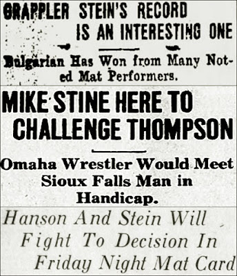 Една интересна негова борба, която е любопитна от българска гледна точка, се провежда на 17-ти февруари 1922 г. в град Уебстър Сити, щата Айова. От няколко месеца насам там се бори българският борец, известен с псевдонима Джордж „Циклона“ Томпсън. После в града пристига Стайн и веднага предизвиква сънародника му да се борят един срещу друг. Стайн твърди, че вече две години кани Томпсън да се борят, но Томпсън винаги му отказва. Този път обаче „Циклона“ приема предизвикателството. Срещата завършва с победа за по-опитния борец Томпсън, който печели в два манша за около 59 минути.