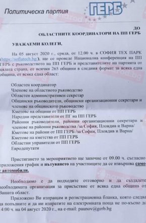 ГЕРБ спешно организира извънредна национална конференция в София Тех Парк. На поканите изрично предупреждават участниците да се придвижват само с автомобили.