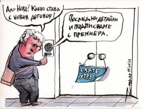 Самият Чавдар Николов обаче няма нов договор и заплата. Във вторник сутринта той публикува във Фейсбук нова карикатура (на снимката), придружена от кратък текст: „Седмицата на преговорите: Борисов снощи каза какъв договор са ми подготвили от Нова. Моля господинът премиер да ме информира и за следващата ми карикатура.“