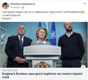 „Световните медии пак не са забелязали „виросолога” на Републиката", сочи буквалният цитат със запазен правопис от Фейсбук публикация на ексминистъра на здравеопазването Десислава Атанасова. По-късно тя поправи поста си с натъртено „вирОсологът”, за да оправдае фрапиращата си грешка с предварителен умисъл. Това е поредният правописен гаф на лица от ГЕРб за по-малко от месец.