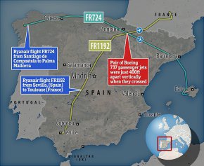 Два пътнически самолета на Ryanai почти са се сблъскали в небето над Памплона в северна Испания около 2,30 ч. на 2 октомври, съобщава DailyMail.