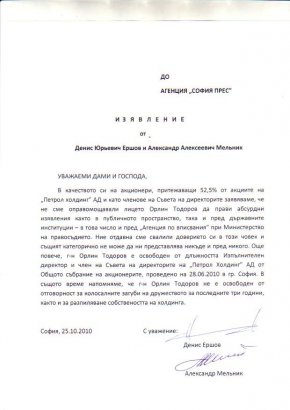 Орлин Тодоров не е оправомощен да дава публични изявления пред държавните институции, пишат в отворено писмо, изпратено и до медиите Денис Ершов и Александр Мельник. "В качеството си на акционери, притежаващи 52,5% от акциите на Петрол Холдинг АД и като членове на Съвета на директорите заявяваме, че не сме оправомощавали лицето Орлин Тодоров да прави абсурдни изявления както в публичното, така и пред държавните институции – в това число и пред Агенцията по вписванията при Министерството на правосъдието. Ние отдавна сме свалили доверието си в този човек и същият категорично не може да ни представлява никъде и пред никого. Още повече, г-н Орлин Тодоров е освободен от длъжността Изпълнителен директор и член на Съвета на директорите на Петрол Холдинг АД от Общото събрание на акционерите, проведено на 28 юни тази година. В същото време напомняме, че г-н Орлин Тодоров не е освободен от отговорност за колосалните загуби на дружеството за последните три години както и за разпиляване собствеността на холдинга", пише още в писмото.