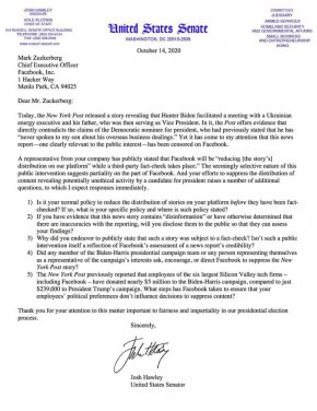 "Ню Йорк Пост публикува история, разкриваща, че Хънтър Байдън е съдействал за среща с украински изпълнителен директор и баща му, който тогава е бил вицепрезидент. В него изданието предлага доказателства, които пряко противоречат на твърденията на кандидата за президент на демократите Джо Байдън, който преди това заяви, че „никога не е говорил с моя син за задграничните му бизнес сделки“. И все пак обърна внимание, че тази новина - явно свързана с обществения интерес - е цензурирана във Facebook", това се казва в писмо на сенатора републиканец Джош Холи до Марк Зукърбърг.