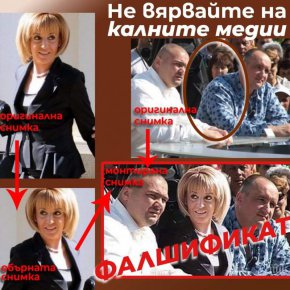 Професионалистът-монтажист на снимки явно е бил слабак по математика-може ли главата на 50-килограмовата Мая да е по-голяма от главата на дебелака до нея? Нещо да е чувАл тоз човек за пропорции? Ма тая Мая с гръден кош като на чичака!А бе тва са подробности бе хора,важно е валят лайна върху опонентите, па АЗ да съм целия в бяло.
