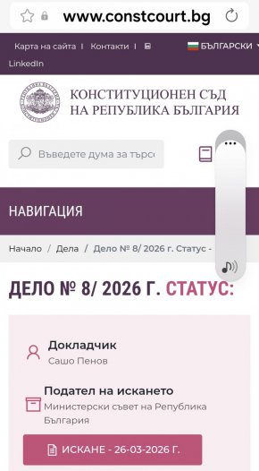 Но пък квартируващият в сградата на същия този Министерски съвет орган - Конституционният съд, ясно е обозначил на сайта си делото, което ще води във връзка с това решение. И докладчик по него, по ирония на съдбата, е експрезидентския човек Сашо Пенов.