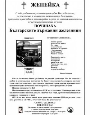 Съюзът на комунистите в България, комунистическото движение "Че Гевара" и Движение "Окупирай България" разпространиха днес призив до българските граждани, в който се обявяват за подкрепа на националната стачка на железничарите, започваща на 24 ноември 2011 г. Призивът е оформен като некролог на БДЖ, в който с типичен ретро-пропаганден и партизански стил се призовава за подкрепа и "решителен отпор":