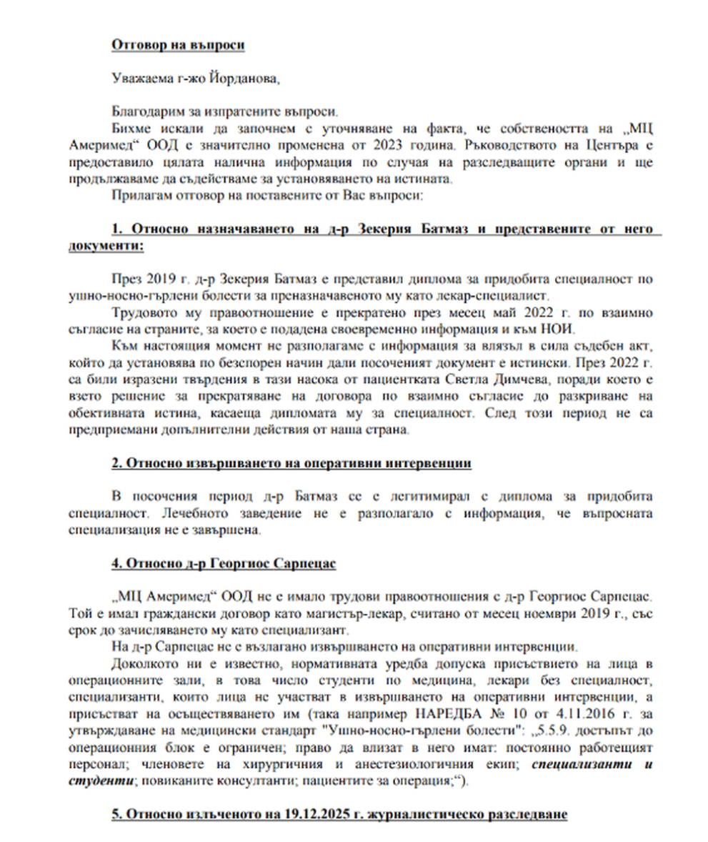 В предходното разследване стана ясно, че пред съда и в търговския регистър д-р Зекерия Батмаз е представил диплома за завършена УНГ специалност в Медицинския университет. Тази диплома обаче се оказва изфабрикувана – с номера, които отговарят на друг студент, подписана от ректор, който не е бил ректор в посочения период и с още редица доказателства, които доказват, че документът е неистински. Въпреки това в периода 2019-2022 г- той е работил в медицински център „Америмед“ като специалист. Поемал е всички ринопластики и септопластики, тъй като е бил единственият УНГ лекар в лечебното заведение.