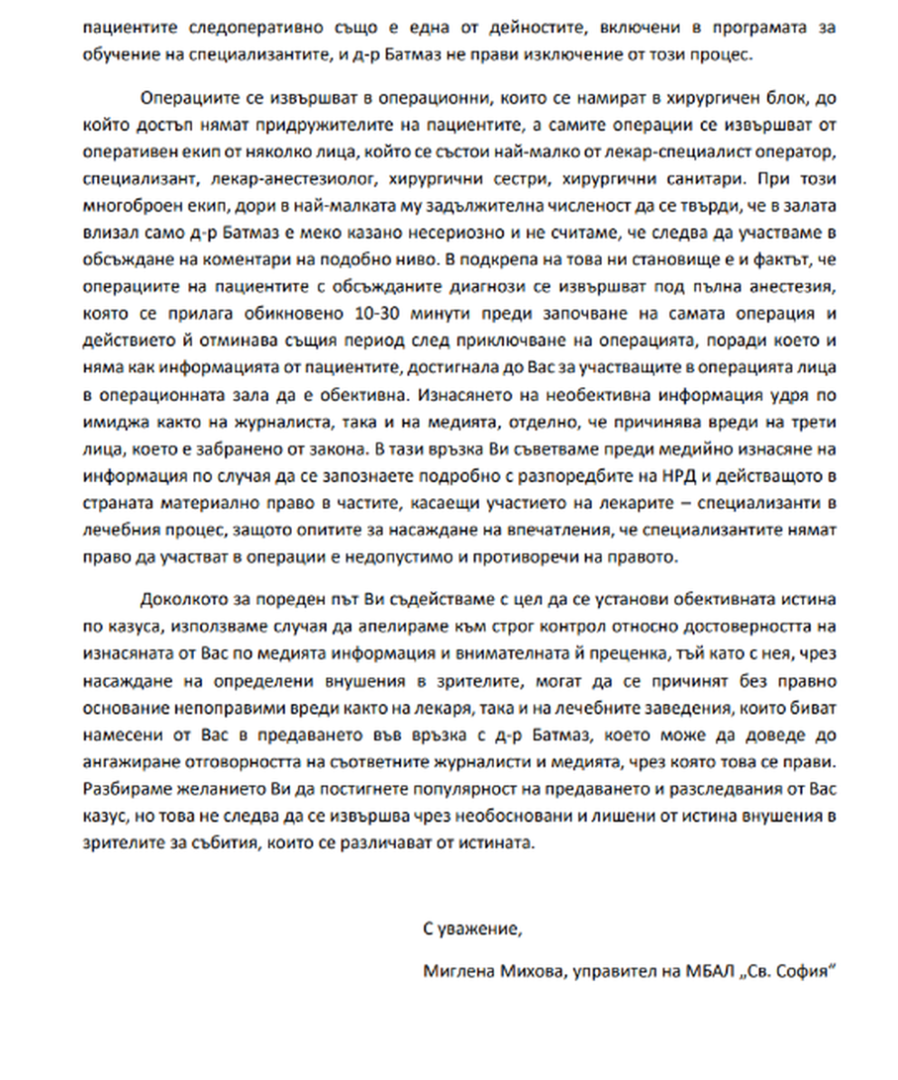 „Бях изненадана, честно казано, когато след неколкократно искане успях все пак да си получа епикризата. Бях изненадана, че всъщност на нея пише друго име, не доктор Батмаз. Докторът, който е описан като лекуващ - никога не ме е преглеждал. Дори след усложненията – единственият, който ми издаваше рецепти и контролираше състоянието ми, беше д-р Батмаз“, категорична е тя.