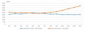 Починали в България по седмици през първото тримесечие на 2020 и на 2021 г.