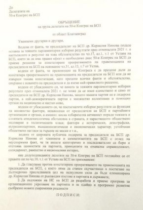Група делегати от област Благоевград на 50-ия конгрес на БСП изпратиха обръщение до останалите делегати в защита на лидера в оставка Корнелия Нинова, довел до исторически катастрофалните резултати на партията на трите поредни избори през 2021 г. Според тях резултатите не зависели от нея и Конгресът не бива да констатира оставката й. Такова положение в партийния устав обаче няма. След подадена оставка се преминава към избор на нов председател. Всъщност, декларацията може да бъде израз на страха на Нинова да се яви на пряк избор за партиен шеф със заявилия вече кандидатурата си Крум Зарков.