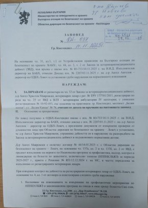 Заличаването е извършено със заповед на директора на Областната дирекция по безопасност на храните - Кюстендил от 14 ноември 2025 г., издадена на основание Закона за ветеринарномедицинската дейност след проверки на Областната дирекция по безопасност на храните - Ловеч.