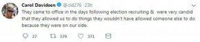 Медийната шефка пусна съобщенията в Туитър като коментар за световния скандал, покрай тегленето на инфо от профилите на 50 млн. избиратели, осъществено от Кембридж Аналитика за Тръмп. С това доказва, че кампанията на Обама е използвала същата технология като тази, заради която демократите сега нападат републиканците, че са употребили. Разликата е само, че Кембридж Аналитика е лъгала, че използва данните само с научна цел. Което не означава, че хората са били съгласни да ги „избомби” Обама.