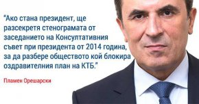 "Ако стана президент ще разсекретя стенограмата от заседанието на Консултативния съвет при президента от 2014 г., за да разбере обществото кой блокира оздравителния план на КТБ", посочва Орешарски.