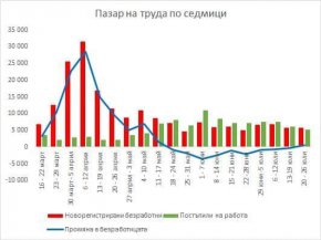 "За пръв път след 17 май данните показват увеличение на безработните лица - в последните седем дни новорегистрираните безработни надвишават броя на започналите работа с 643. За последните 4 седмици броят на безработните е намалял с 1263, докато през юни - с 9323. След като в периода от 16 март до 17 май регистрираните безработни нараснаха 102 869, към 26 юли увеличението от началото на кризата е 89 639 по данни на Агенцията по заетостта", пише Лъчезар Богданов. Реално безработните са в пъти повече.