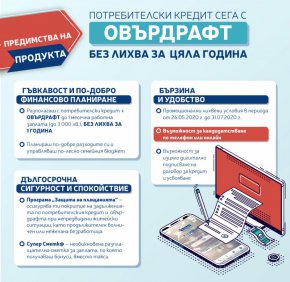 Пощенска банка предлага на своите клиенти потребителски кредит с промоционални условия и с възможност да изтеглят овърдрафт без лихва за първите 12 месеца. Кредитът може да бъде използван както с цел покриване на текущи нужди, така и за обединение на задълженията, като клиентите имат възможност да се възползват и от допълнителни преференциални условия по кредита, в случай че отговарят на изискванията на банката. В периода на кампанията – от 26.05.2020 г. до 31.07.2020 г., клиентите на Пощенска банка могат да заявят кредит до 70 000 лева и овърдрафт без лихва за първата година, с размер на една нетна заплата или до 3 000 лв. Те могат да се възползват от предложението за овърдрафта при усвоен потребителски кредит и наличен превод на работна заплата по сметка в банката. Одобреният лимит по овърдрафта може да се използва многократно, изцяло или на части, както за теглене на суми в брой, така и за заплащане на стоки и услуги.