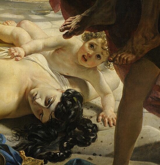 Тя се опитала да избяга с колесница, но подземен трус изхвърлил от паважа калдъръма и колелото я прегазило. Брюлов изобразява най-трагичния момент. Жената изпаднала от колесницата и умряла. А бебето ѝ, оцеляло при падането, плаче до тялото на майка си.