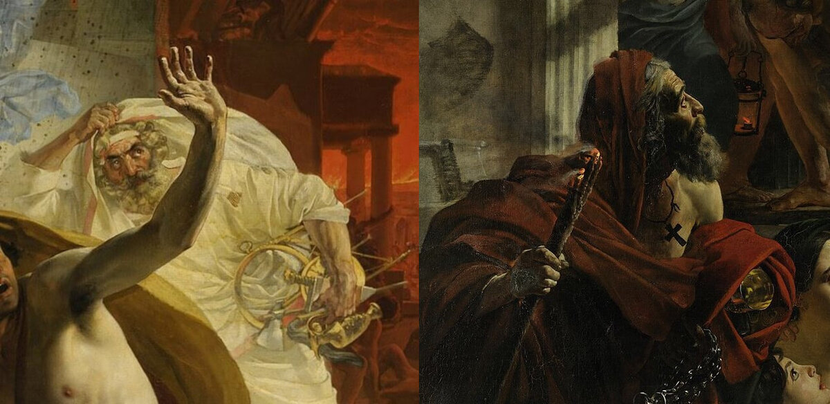Можем да го разпознаем по кръста на гърдите му. Той гледа смело към разярения Везувий. Ако ги разгледаме заедно, става ясно, че Брюльов специално противопоставя християнството на езичеството, а не в полза на последното.