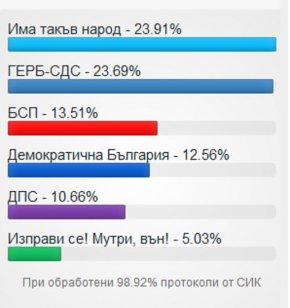 Партията на Слави Трифонов "Има такъв народ" (ИТН) води с минимална преднина пред коалицията ГЕРБ-СДС при обработени 98,92 процента от протоколите на Секционните избирателни комисии в РИК.