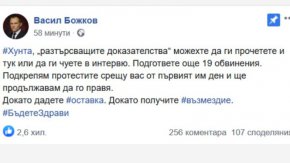 "Разтърсващите доказателства“ можехте да ги прочетете и тук или да ги чуете в интервю. Подгответе още 19 обвинения. Подкрепям протестите срещу вас от първия им ден и ще продължавам да го правя докато дадете оставка", написа бизнесменът Васил Божков в социалната мрежа "Фейсбук".