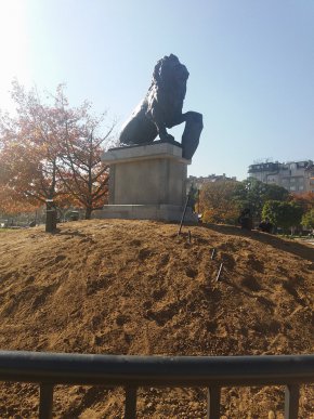 Близо до мястото, откъдето беше премахнат паметникът 1300 г. България, върху купчина пръст беше положен лъвът, който до 1977 г. е бил част от мемориала на загиналите за България. Пред него беше сложена опознавателна табела, която обаче блести с неграмотност. От една страна неграмотност езикова, тъй като е написано, че става въпрос за „Iи VIти софийски полкове”. На български език правилно е „Първи и шести полк”, а VI-ти би било вярно, ако с букви думата се изписваше „шестТи”, ала в нея има само едно „т”.След римски цифри няма нужда от разширения.