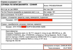 Два парцела в премиерския район Банкя по 12 евро на кв. м. е закупил шефът на Специализирания наказателен съд Георги Ушев през 2017 г., разкрива Биволъ. Имотите са урегулирани за ниско строителство. Намират се в центъра на балнео курорта, не в покрайнините като имението на премиера Борисов. Справка в сайтовете за продажба на имоти показва, че УПИ в Банкя много трудно може да се намери на цена под 50 евро, но в никакъв случай за 4 пъти по-малко пари.