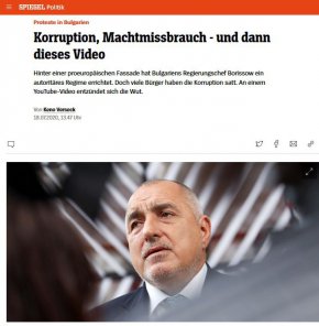 "Досега на мнозина това изглеждаше като зло, срещу което са безсилни. Но един случай на злоупотреба с власт предизвиква национално възмущение. Става въпрос за парче плаж, близо до което живее един от най-тайнствените бивши български политици, охраняван за сметка на данъкоплатците. Случаят предизвика най-големите политически протести от години - десетки хиляди хора демонстрират в страната дни наред, настоявайки за оставката на правителството на десния премиер Бойко Борисов. Случаят показва също, че след почти 10 години и половина членство в ЕС България не е провела реални конституционни реформи. Правната сигурност зависи от добрата воля на властите, съдебната система е до голяма степен под политически контрол. Случаите на корупция рядко се наказват и журналистите, които съобщават за тях, са заплашвани. Но тъй като премиерът Бойко Борисов, за разлика от Виктор Орбан, не дразни с външната си политика, проблемната вътрешнополитическа ситуация не е проблем за Брюксел". Това пише "Шпигел онлайн" в коментар за България, цитиран от "Сега".