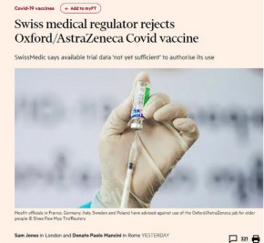 Швейцарският медицински регулатор заяви, че не може да разреши използването на ваксината на Oxford / AstraZeneca срещу Covid-19 въз основа на наличните данни от проучването, което е допълнителен пречка за пускането на англо-шведската ваксина, съобщава Financial Times. Напомняме, че България заяви най-много бройки именно от нея, въпреки че беше ясно, че закъснява, а напоследък се разбра, че има едва 59,5% ефективност и няма да могат да бъдат доставени над 60% от дозите. Причината е проста – представител на фирмата в България е майката на евродепутата от ГЕРБ Ева Майдел.