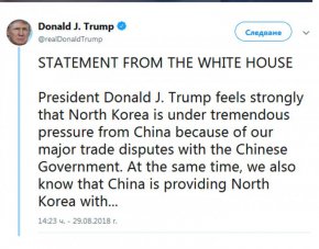 В изявление на Белия дом, публикувано от Тръмп в Туитър, се посочва, че Пхенян е бил обект на "огромен натиск от Китай поради големите ни търговски спорове с китайското правителство".