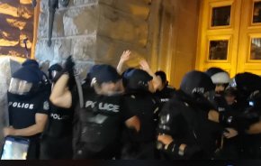 Двама полицейски служители, без защитно облекло, които са охранявали входа, са били нападнати и бити.