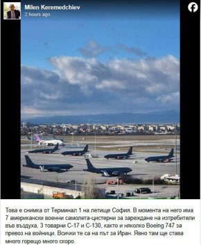 "В момента на летището има 7 американски военни самолета-цистерни за зареждане на изтребители във въздуха, 3 товарни С-17 и С-130, както и няколко Boeing 747 за превоз на войници. Всички те са на път за Иран. Явно там ще става много горещо, много скоро", написа той към кадъра.