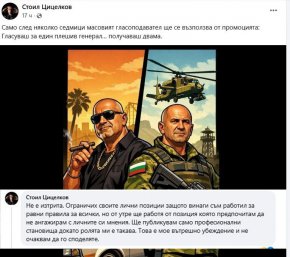 Само след седмици масовият гласоподавател ще се възползва от промоцията: Гласуваш за един плешив генерал... получаваш двама" - с такъв коментар Цицелков публикува шарж, изобразяващ Радев и лидера на ГЕРБ Бойко Борисов като екшън герои - единият с автомат в ръка, а другият - с пура и пистолет.