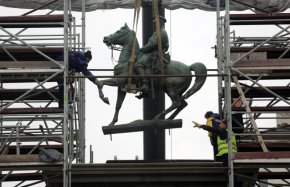 Поставят фигурите на великия княз Николай Николаевич и Граф Игнатиев на паметника на Цар Освободител днес. Подменена е конструкцията в краката им. Фигулите са почистени като е запазена оригиналната им патина. Голям кран поставя в момента два от по-малките коне-фигури на паметника на Цар Освободител. С огромни въжета монтажници окачват два коня, поставят трупчета за безопасност и ги вдигат на постамента.