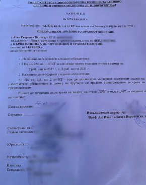 Проф. Асен Балтов е уволнен от „Пирогов” дисциплинарно и дължи неустойка на лечебното заведение. Това е записано в заповедта за освобождаването му, която самият Балтов предостави на NOVA.