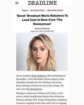 Холивудското светско издание Deadline обяви, че Мария Бакалова ще изиграе главна роля в романтичната комедия The Honeymoon. Това потвърди и актрисата, споделяйки публикация от изданието в Инстаграм профила си с думите "Развълнувана съм да играя в този филм, както и да бъда част от екипа на продуцентите…“.