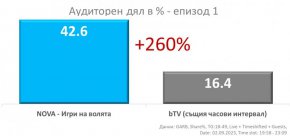 След забележителните постижения през пролетта, NOVA започна и есенния сезон с рекорд. Той бе поставен от петия сезон на най-екстремния риалити формат Игри на волята, с който медията стартира есенната си програма снощи. Според официалните пийпълметрични данни, първият епизод на формата е регистрирал аудиторен дял сред населението в активна възраст (18-49 г.) от 42.6%. Този резултат е най-високият старт за Игри на волята от появата му в българския телевизионен ефир през 2019 година. Освен рекорд, първият епизод на хитовото предаване тази година бележи и завидна преднина пред основния медиен конкурент.