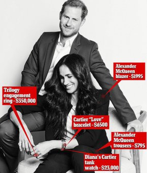 Меган Маркъл и принц Хари пуснаха фотосесия по случай участието си в епизод на Time100 Talks. Списанието има класация за 100-те най-влиятелни хора в света и ги кани да разговарят по различни теми. Това е първата фотосесия на херцозите на Съсекс, след абдикацията им от кралските им задължения. Двойката избра класически, семпли визии за снимките, но дори и това не отърва не ги отърва от много остри критики. Причината за това е визията на Меган. Стана ясно, че цялостният тоалет на херцогинята, заедно с аксесоарите, надвишава $382 000. Китката й е украсена гривна и часовник на Cartier, съответно за $6500 и $23 000 . Часовникът е бил притежание на принцеса Даяна. Най-скъпото е брачната халка на Меган, която струва $350 000. Херцозите започват да участват активно във все повече социални събития и дейности, които обаче често предизвикват гняв у техните критици. Неотдавна чичото на Кейт Мидълтън се изказа жлъчно към двойката, наричайки ги марионетки.