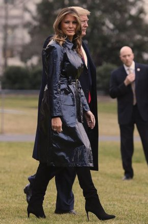 49-годишният бивш модел носеше лъскав тренчкот, пристегнат в талията с широк колан от същата материя. Дрехата, чиято цена е 2 хил. долара, е дело на марката "Scanlan Theodore". Мелания комбинира палтото си с велурени ботуши над коляното на висок ток, а косата си остави да пада свободно върху раменете си.