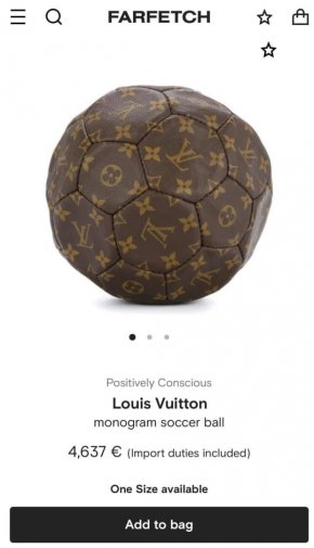 изчакайте да видите собствената футболна топка Monogram на Louis Vuitton за € 4 637. Можете да я закупите в Сингапур чрез онлайн платформа за луксозно модно пазаруване Farfetch.Не сме точно сигурни как луксозната мода и футболните топки се съчетават. Може би къщата на Louis Vuitton е имала излишна кожа от тяхното производство на чанти и е решила да я преназначи за своята Monogram Soccer Ball.