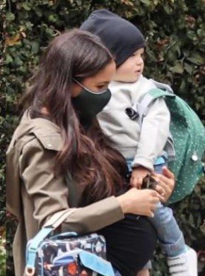Папараци успяха да снимат съпругата на принц Хари по време на разходката ѝ из Лос Анджелис. Въпреки маската тя е лесно разпознаваема. С Меган бе и Арчи, първородният син на двойката, когото Маркъл носи на ръце, въпреки напредналата си бременност. Снимките бяха публикувани от Page Six на Ню Йорк Пост. На тях Арчи e облечен в дънки, сив суетшърт, маратонки, шапка и зелена раница. Синът на принц Хари и Меган Маркъл на 6 май ще навърши 2 години. Меган също е спортно облечена - палто, дънки, черна блуза, покриваща и наедрялото ѝ коремче, както и ниски обувки. По-късно снимките се появиха и в Инстаграм профил на херцогинята. Херцогинята на Съсекс трябва да роди момиче това лято. Тя и принц Хари съобщиха пола на второто си дете по време на гостуването си при Опра Уинфри.